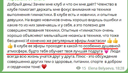 | ⏩ В клубе проходят регулярные прямые эфиры с Анастасией, где вы сможете получить обратную связь по упражнениям, а также задать любые вопросы по темам красоты, молодости, полезных привычек и ЗОЖ.