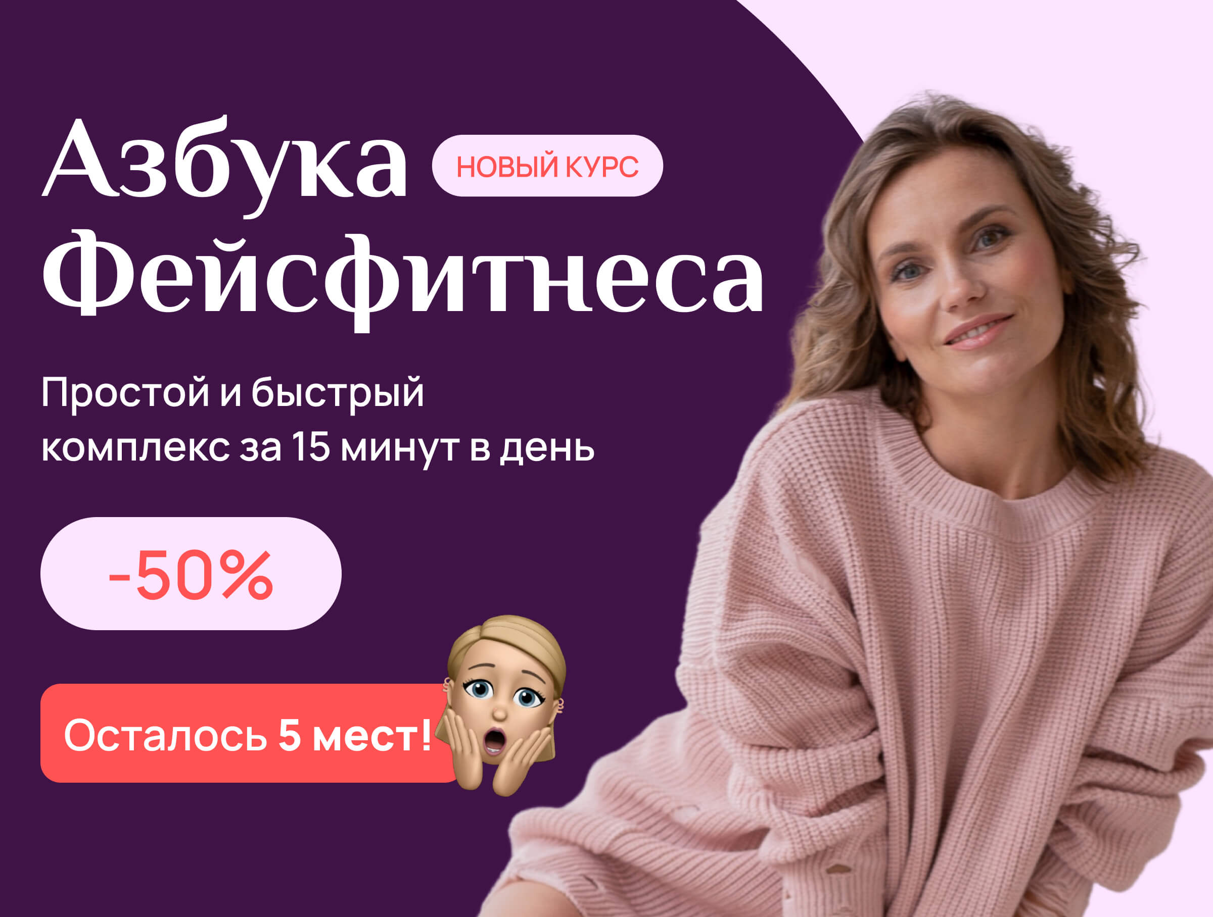 ✅ Тогда я поняла, что нужно искать другой способ борьбы с возрастными изменениями. И я его нашла! Сейчас моё лицо в лучшем состоянии, чем в 27 лет. Этот способ — фейсфитнес. Попробуйте его и убедитесь в эффективности лично! | | | | Набор на курс «Азбука Фейсфитнеса» по лучшей цене может закрыться в любой момент! | | | | При покупке в ближайшее время в подарок вы получите: | | | | | доступ в закрытый чат со мной и куратором; | | | | 5 консультаций экспертов; | | | | сборник упражнений курса с неограниченным доступом! | | | | | Почему же инъекции лишь ускоряют старение? | | | | ✨ Все дело в том, что любое агрессивное вмешательство нарушает трофику тканей и обменные процессы. Наши клетки страдают! Инъекции дают быстрый и яркий эффект, но потом мы «откатываемся» назад, и лицо выглядит еще хуже.