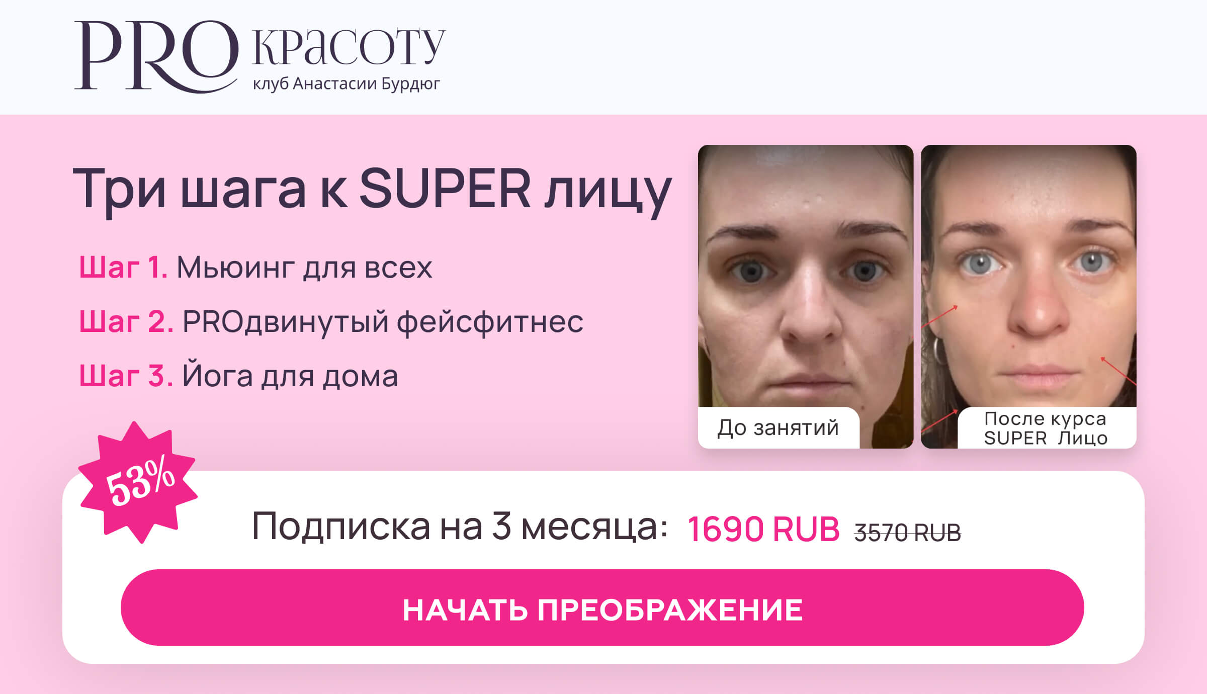 Отвечаю на этот вопрос в видео.⏬ | | | | Откройте для себя библиотеку материалов, оформив подписку на клуб PRO Красоту! | | | | ❗ Сейчас действует самое выгодное предложение на трехмесячный доступ: 1690 рублей вместо 3570! | | | | Вас ждет поэтапное преображение в 3 шага | | | | | 1 шаг. Изучение и подключение техники мьюинга для усиления эффекта от упражнений в нижней трети лица. | | | | 2 шаг. Освоение новых, более глубоких упражнений на продвинутом курсе по гимнастике для лица SUPER Лицо PRO. | | | | 3 шаг. Подключение тренировок для тела, которые подарят вам энергию, здоровье и стройность. | | | | | Успейте оформить подписку на 3 месяца с максимальной скидкой! Сделайте первый шаг к SUPER Лицу уже сегодня ⏬ | | | | | | Вы получили это письмо, потому что оставили свои данные на сайте anyclass.com | | | |