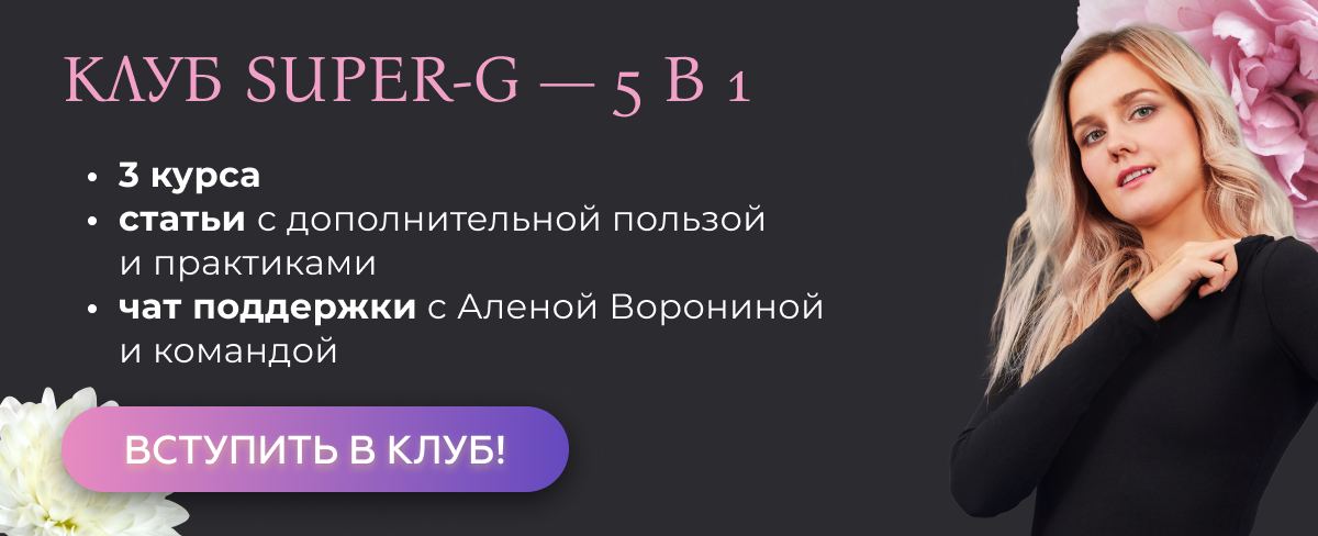✨ Клуб SUPER-G — сообщество, в котором девушки поддерживают, вдохновляют и мотивируют друг друга не останавливаться на достигнутом и проходить новые курсы. | | | | При вступлении в клуб вы получите доступ к топовым курсам: | | | | ⭐ SUPER-G База