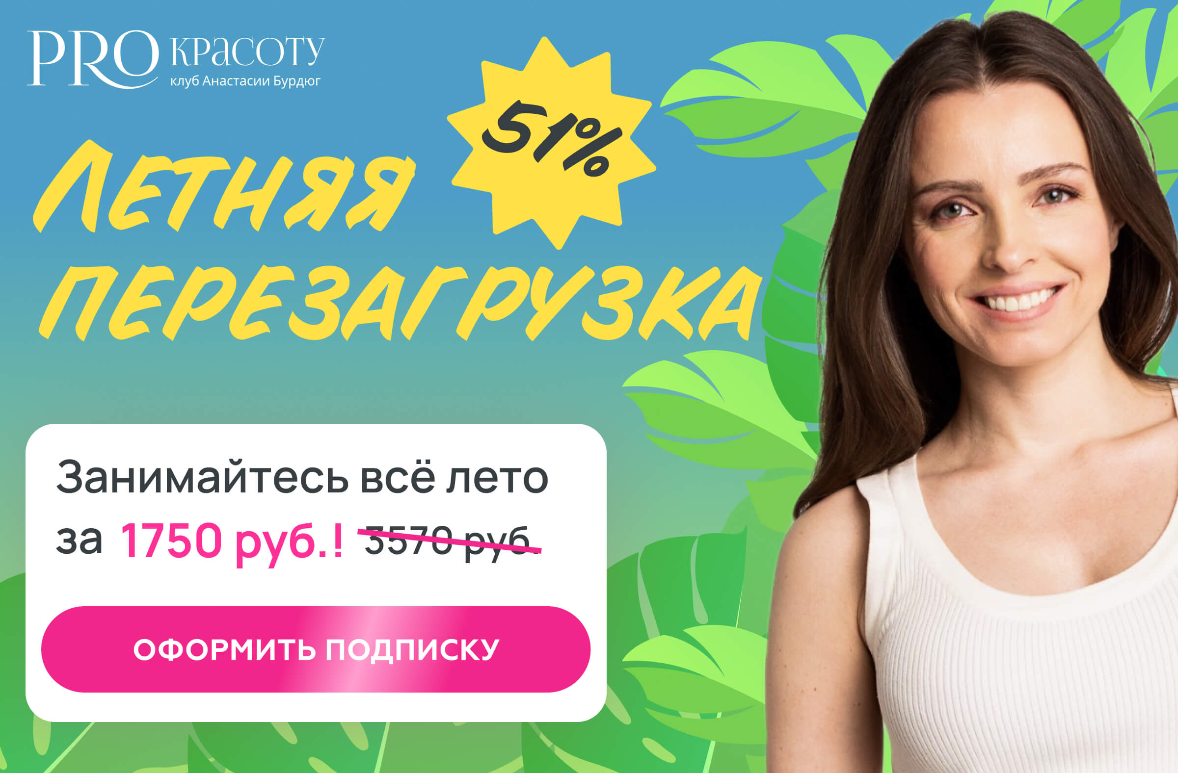 | Лето — это маленькая жизнь! ❤️ И идеальное время для тотального преображения ✨ | | | | Запустите летнюю перезагрузку с супертарифом клуба PRO Красоту 3 месяца доступа КО ВСЕМ курсам клуба СРАЗУ = 1750 рублей | | | | Обычно курсы открываются последовательно каждый месяц согласно программе «Путь к SUPER лицу». Присоединившись к клубу сегодня со скидкой 51%, вы сможете составить эффективную программу на лето на базе всех курсов и заниматься в своём темпе.