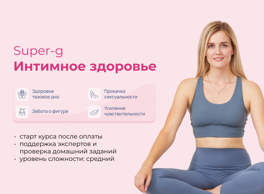 Сегодня у вас ещё есть возможность присоединиться к обучению на курсе «SUPER G: интимное здоровье» — вы будете уделять женскому здоровью всего 20−30 минут в день, а эффект будет с вами долгие годы!