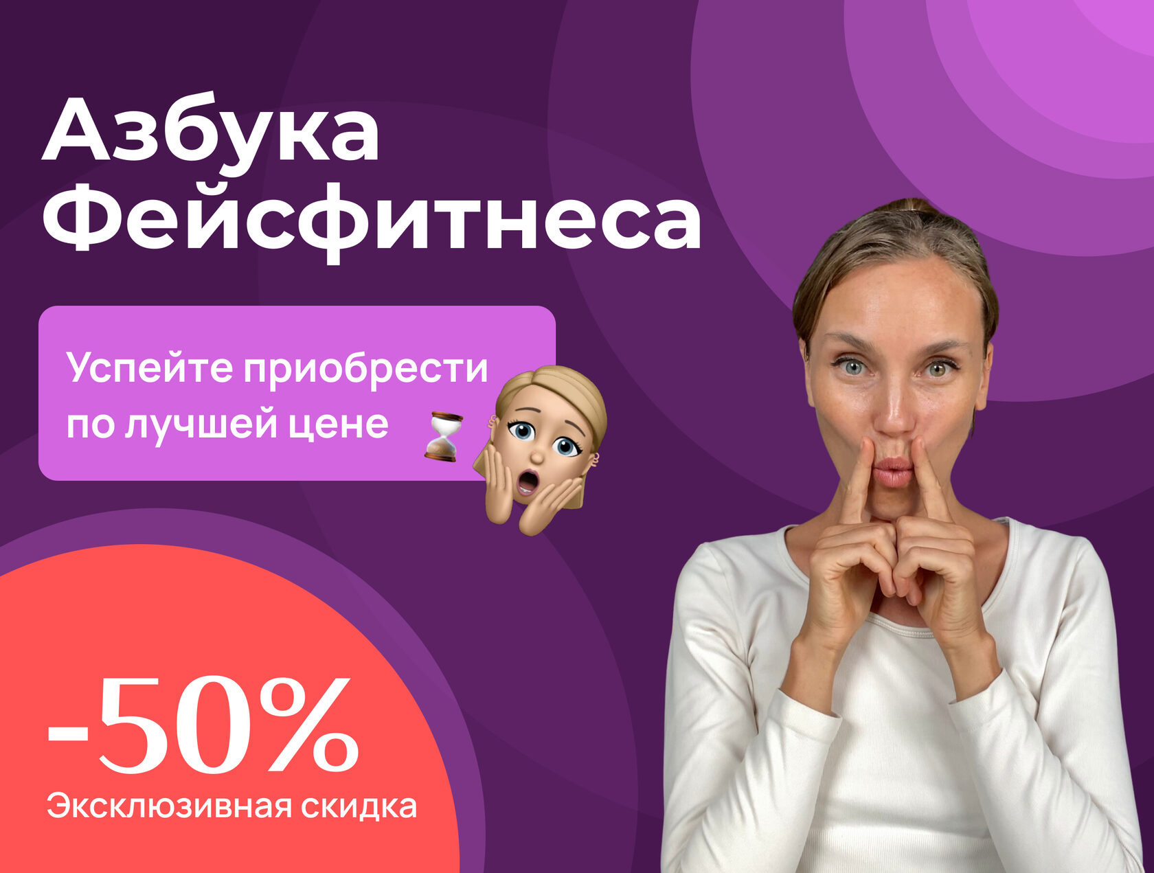 ✅ Один из бриллиантов курса Азбука Фейсфитнеса — упражнение на сухожильный шлем. Оно позволяет эффективно раскрыть лицо, препятствует гравитационному птозу и избавляет от морщин. | | | | Только сегодня и только по ссылке из этого письма для вас действует эксклюзивная скидка на курс Азбука Фейсфитнеса. Присоединяйтесь с выгодой 50%! Такого предложения нет больше нигде ⏬ | | | | После приобретения курса Азбука Фейсфитнеса вы получите не только полный комплекс упражнений для проработки всех зон лица и шеи, но и: | | | | | доступ к закрытому чату со мной, куратором и единомышленницами; | | | | 5 консультаций с экспертом; | | | | сборник упражнений курса с вечным доступом. | | | | | А еще совсем скоро мы добавим в программу новые материалы: занятия на осанку и продвинутый урок для тех, кто уже освоил базу. Материалы будут доступны только участницам курса!