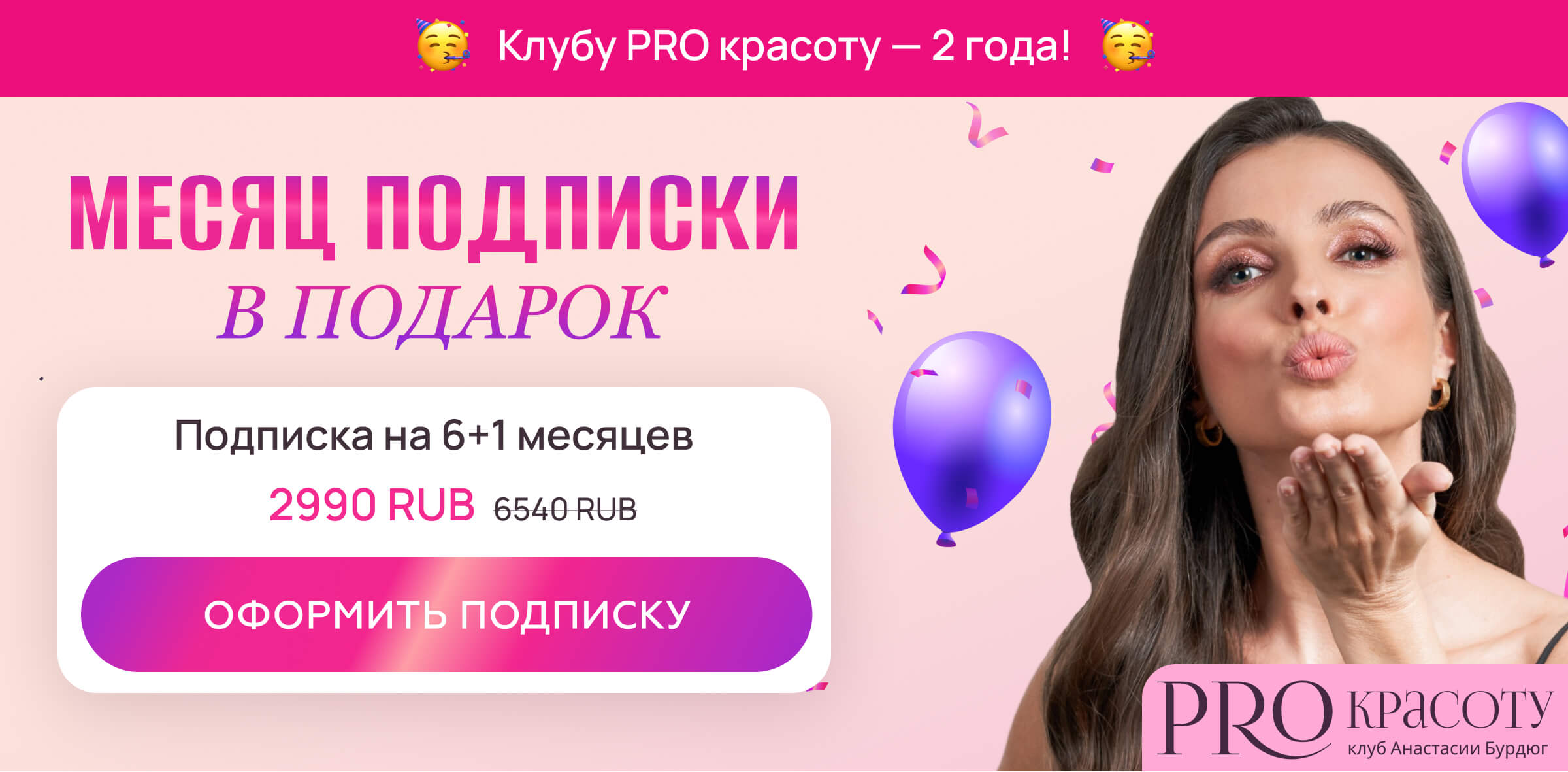 Успейте оформить подписку до 10 июля ⤵️ | | | | Помимо участия в летнем кемпе, при оформлении подписки на клуб PRO Красоту вы получите: | | | | | онлайн-встречи с Анастасией Бурдюг; | | | | эксклюзивные советы по уходу за собой на платформе клуба; | | | | поддержку экспертов и участниц клуба; | | | | разборы ошибок при выполнении упражнений; | | | | доступ в закрытый чат единомышленниц. | | | | | Только сейчас, в честь дня рождения клуба PRO Красоту, при оформлении полугодовой подписки вы получаете 1 месяц доступа бесплатно!