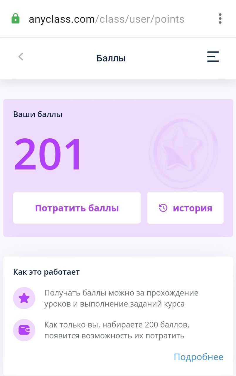 | За активность на курсе вы набрали уже {user.scoresAmountSum} баллов. Отличная работа! ✨ | | | | Напоминаем, что вы можете их использовать для приобретения других курсов AnyClass. | | | | Чтобы использовать баллы для записи на другие курсы, зайдите в личный кабинет по кнопке выше и нажмите кнопку «Потратить баллы»: | | | | Так держать! Отличных тренировок ❤ | | | | | | Вы получили это письмо, потому что оставили свои данные на сайте anyclass.com | | | |