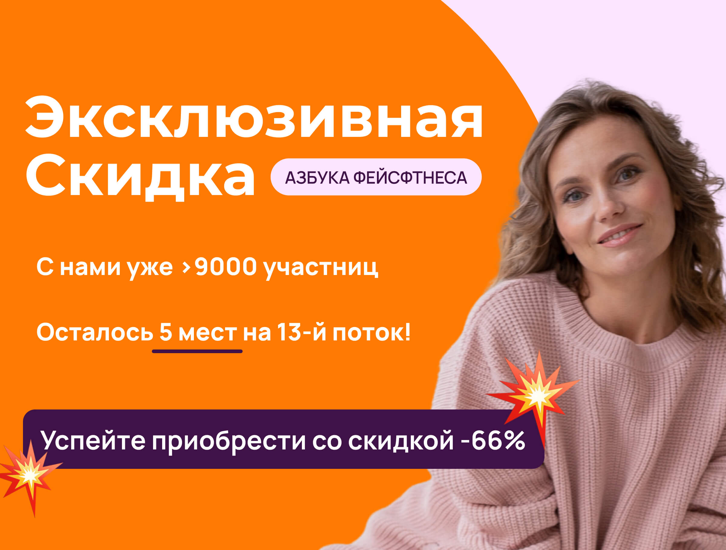 Осталось всего 5 мест на 13 поток курса Азбука Фейсфитнеса со скидкой 66%. Поторопитесь занять одно из них! | | | | Более 9000 участниц уже занимаются на курсе Азбука Фейсфитнеса. Первый результат заметен через неделю регулярных занятий!⭐ | | | | | губы становятся объемнее, а контур более четким; | | | | сокращается межбровная складка и носогубки; | | | | уменьшается глубина морщин; | | | | верхние веки приподнимаются; | | | | лицо выглядит более свежим и молодым. | | | | | БОНУС! Я подготовила для своих учениц новый продвинутый урок. Совсем скоро мы добавим его в курс Азбука Фейсфитнеса.