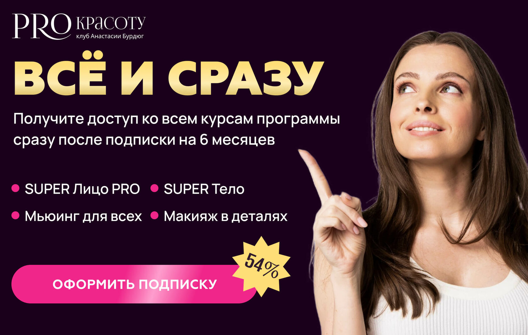 Ныряем в естественное омоложение с головой! Сразу после оплаты подписки вам станут доступны курсы: | | | | | SUPER Лицо PRO продвинутая ступень гимнастики для лица с новыми более сложными упражнениями для самых проблемных зон, а также эффективными упражнениями для спины, которые улучшат вашу осанку | | | | Мьюинг для всех супертехника естественной коррекции прикуса от врача-стоматолога, которая усилит эффект упражнений в нижней трети лица, сделает овал более четким и избавит от второго подбородка | | | | SUPER Тело упражнения для дома от моего личного тренера, которые помогут держать тело в тонусе без изнурительных тренировок в спортзале | | | | Макияж в деталях полный набор знаний по созданию макияжа от профессионального визажиста: от выбора косметики и кистей до создания эффектного вечернего образа | | | | | Суперпредложение, которое нельзя упускать.