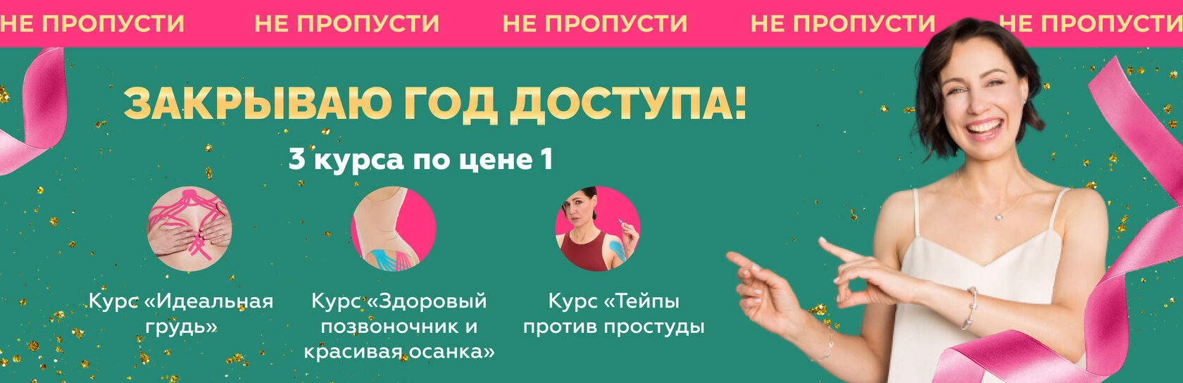 Для ваших лучших результатов я создала комбо 3 в 1, которое включает в себя курсы: | | | | | Здоровый позвоночник и красивая осанка | | | | Тейпы против простуды (подходит детям от 3-х лет) | | | | | Комплексный подход творит чудеса: без пластики и операций! Приобретая 3 в 1, вы платите за 1 курс, а получаете сразу 3.