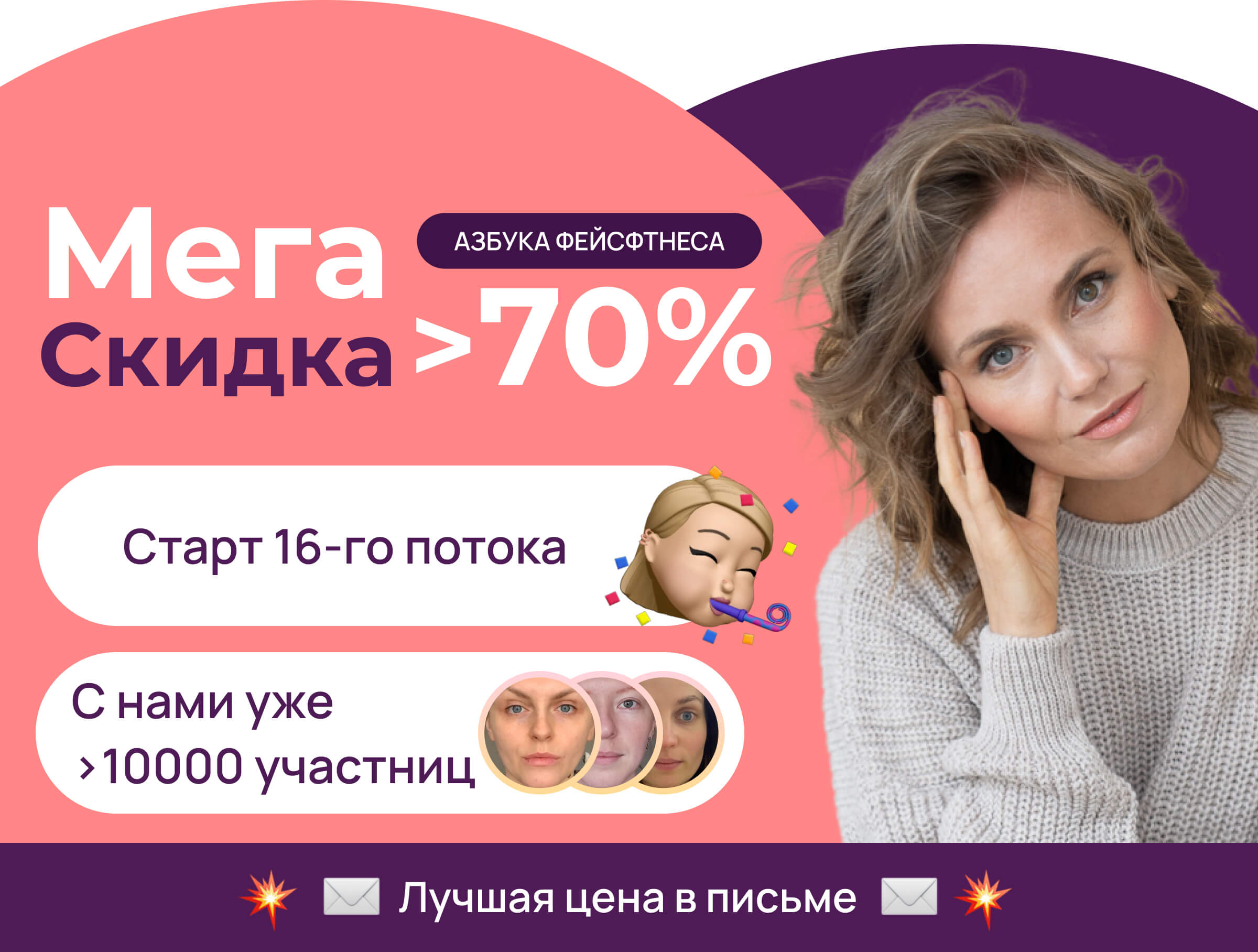 Я предлагаю отставить на время все «чудотворные» кремы, обещающие убрать морщинки, и попробовать гимнастику для лица с курсом Азбука Фейсфитнеса —действенный способ сэкономить от 50.000 в год на косметику и омолаживающие процедуры! |