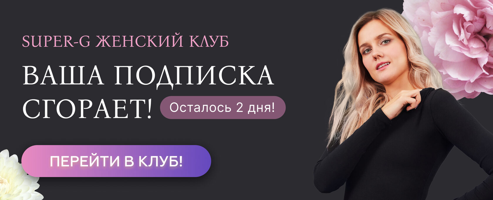 | {user.name}, здравствуйте! | | | Напоминаю, о вашей действующей подписке на клуб «SUPER-G». От всего сердца благодарю за доверие и надеюсь, что вам всё нравится ❤️ Так как у вас отключено автопродление подписки, через 2 дня доступ к материалам клуба будет закрыт. Чтобы не останавливаться на достигнутых результатах, а также сохранить за собой скидку, по которой вы приобретали подписку, мы отправим вам письмо в день окончания тарифа. Вы сможете возобновить подписку и продолжить заниматься в клубе вместе с нами. После продления подписки вам по-прежнему будут доступны все преимущества клуба: - доступ к курсу «SUPER-G База»,