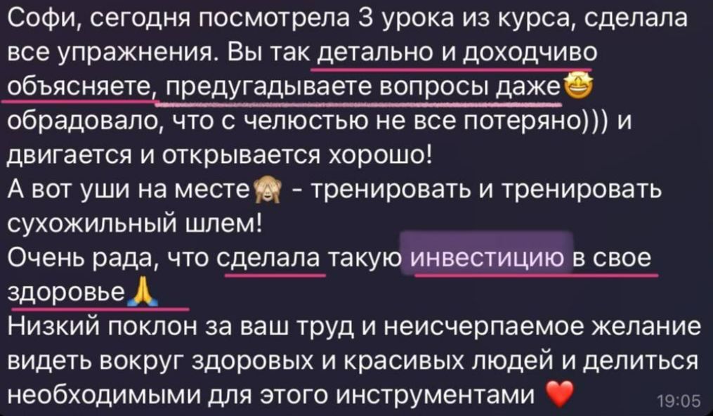 ⏩ Но сперва важное объявление: совсем скоро финальная распродажа лета подойдет к концу. Только сегодня вы можете присоединиться к курсу Азбука Фейсфитнеса со скидкой 80%! | | | | «Посмотрела 3 урока из курса, вы так детально и доходчиво объясняете, даже предугадываете вопросы! Я очень рада, что сделала такую инвестицию в свое здоровье» — делится обратной связью моя ученица. | | | Уже за пару недель тренировок на курсе Азбука Фейсфитнеса наша сегодняшняя героиня заметила, как: - подтянулись веки;