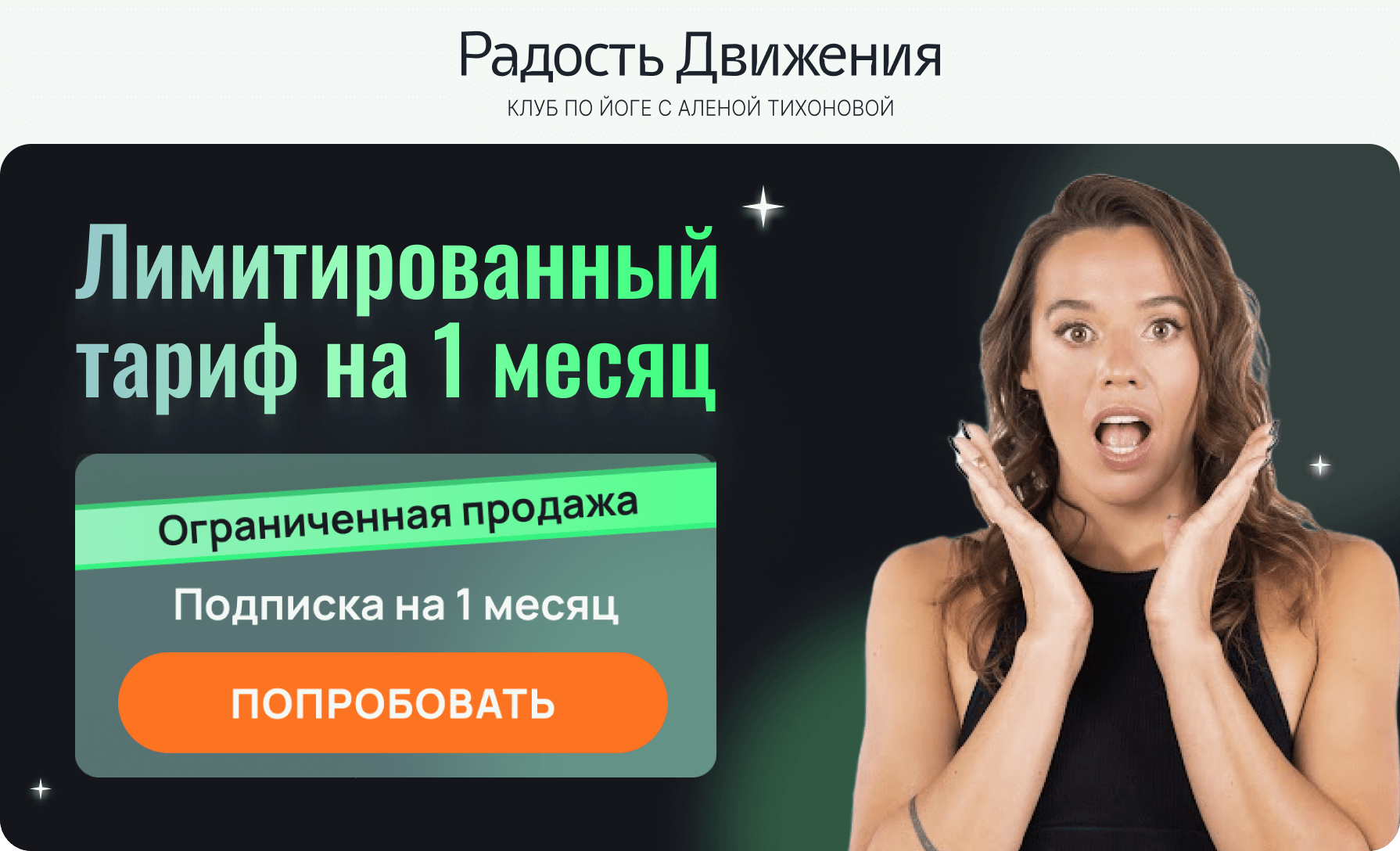 ✅ углубите свою практику и скорректируете возможные недочеты благодаря прямым эфирам и живым онлайн-тренировкам с Аленой Тихоновой; ✅ получите обратную связь от эксперта по йоге в закрытом чате на любые вопросы; ✅ обретете круг единомышленниц, поддержку и мотивацию; ✅ снизите уровень тревожности и стресса; ✅ получите концентрат знаний для здоровья и благополучия из библиотеки клуба; ✅ сможете позаниматься по записям предыдущих онлайн-тренировок, сохраненных на платформе клуба. | | | | Подписка на 1 месяц — то, что доктор прописал для тех, кто сомневается в онлайн-занятиях! Вы поймете, подходит ли вам формат клуба и ощутите все его преимущества лично.