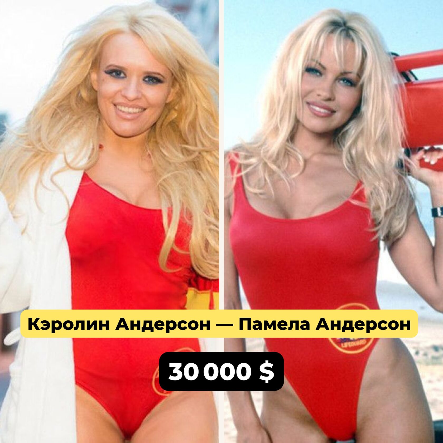 1️⃣ Кэролин Андерсон — Памела Андерсон | | | | Англичанка Кэролин Андерсон просто обожает звезду «Спасателей Малибу» и свою однофамилицу — Памелу Андерсон. Девушка потратила более 30 000 долларов на одно только увеличение груди (в то время как сама Памела избавилась от грудных имплантов). Помимо пышного бюста, Кэролин во всем копирует кумира: она красится, двигается и разговаривает точь-в-точь как Памела.