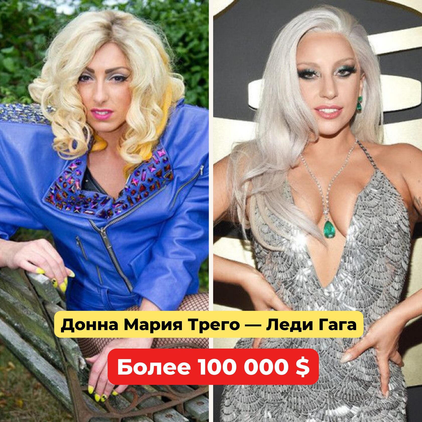 2️⃣ Донна Мария Трего — Леди Гага | | | | Британка Донна Мария Трего потратила более 100 000 долларов, чтобы добиться внешнего сходства со своим кумиром — Леди Гагой. Девушка разменяла пятый десяток, но, как говорится, любви все возрасты покорны. Донна Мария продолжает делать пластические операции и мечтает стать двойником эксцентричной звезды.