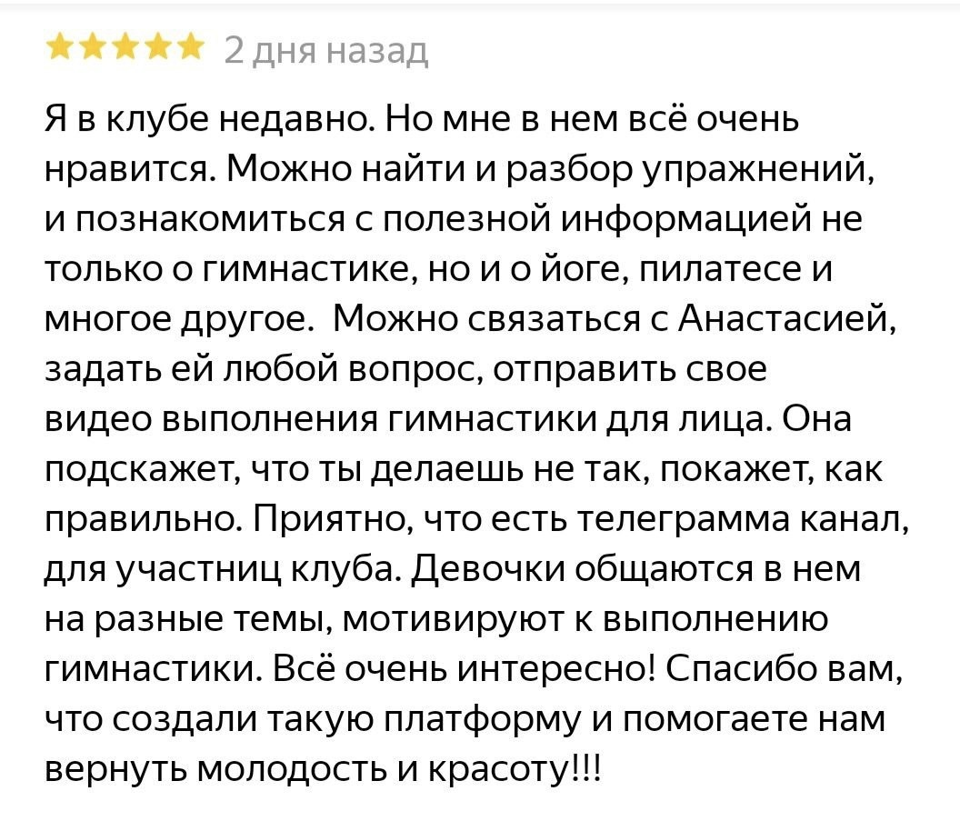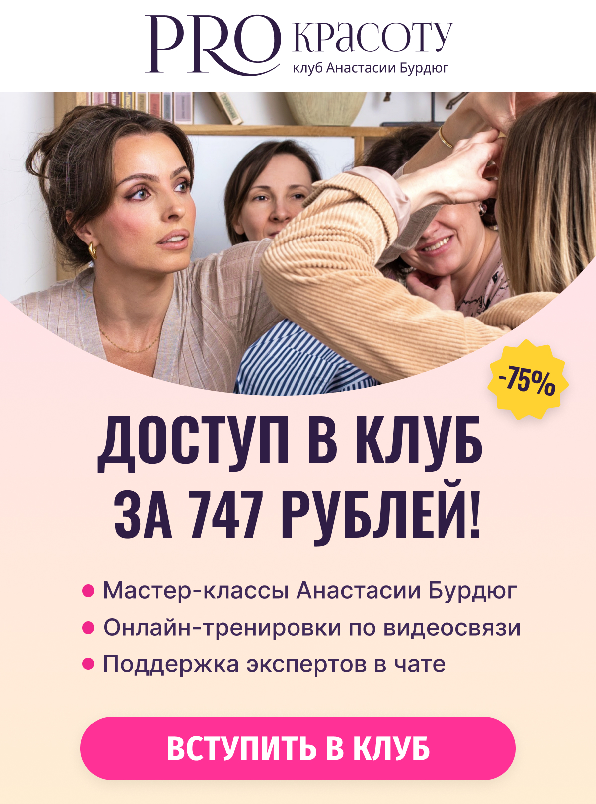 ❤️ корректировки техники от Анастасии Бурдюг — на мастер-классах наша наставница разберет ваши ошибки при выполнении упражнений и подскажет, как их избежать; ❤️ групповые онлайн-тренировки с Анастасией — участницы занимаются гимнастикой для лица и получают обратную связь по технике в режиме онлайн; ❤️ прямые эфиры с Анастасией — получите ответ на любой волнующий вас вопрос; ❤️ возможность задать вопрос по упражнениям в видеоформате — персональные ответы от автора курса SUPER Лицо каждый вторник; ❤️ ответы от аттестованного эксперта по гимнастике для лица — ежедневно в закрытом чате; ❤️ поддержка и мотивация в закрытом чате — заниматься с единомышленницами легче и веселее; ❤️ видеоразборы ошибок на платформе клуба; ❤️ прямые эфиры с приглашенными экспертами — йога, пилатес, питание и многое другое; ❤️ онлайн-встречи в записи, а также полезные материалы в библиотеке клуба — смотрите в любое удобное время! | | | | Вступайте в клуб PRO Красоту с суперскидкой, доведите технику до совершенства и получайте видимый результат от гимнастики для лица в разы быстрее! ⭐ | | | | | | Вы получили это письмо, потому что оставили свои данные на сайте anyclass.com | | | |