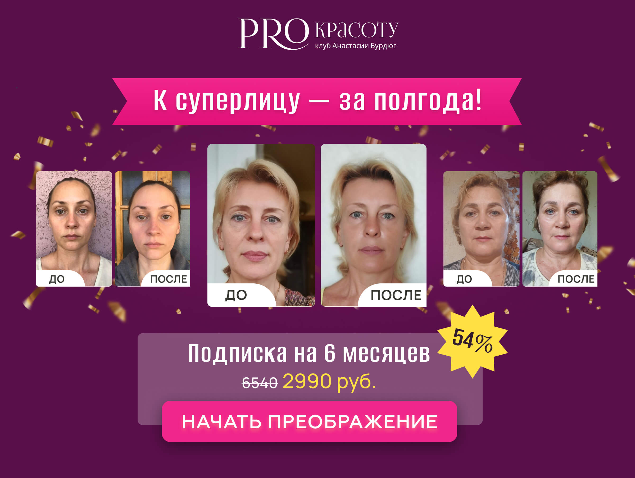 ⏩ За полгода в клубе вы пройдете все курсы Анастасии Бурдюг для лица и тела, а также узнаете секреты макияжа с профессиональным визажистом. После прохождения программы «Путь к SUPER Лицу» вас ждет подарок: курс AnyClass на выбор — йога, пилатес, зрение, история, танцы и другое. | | | | Омоложение происходит быстрее в клубе PRO Красоту за счет: