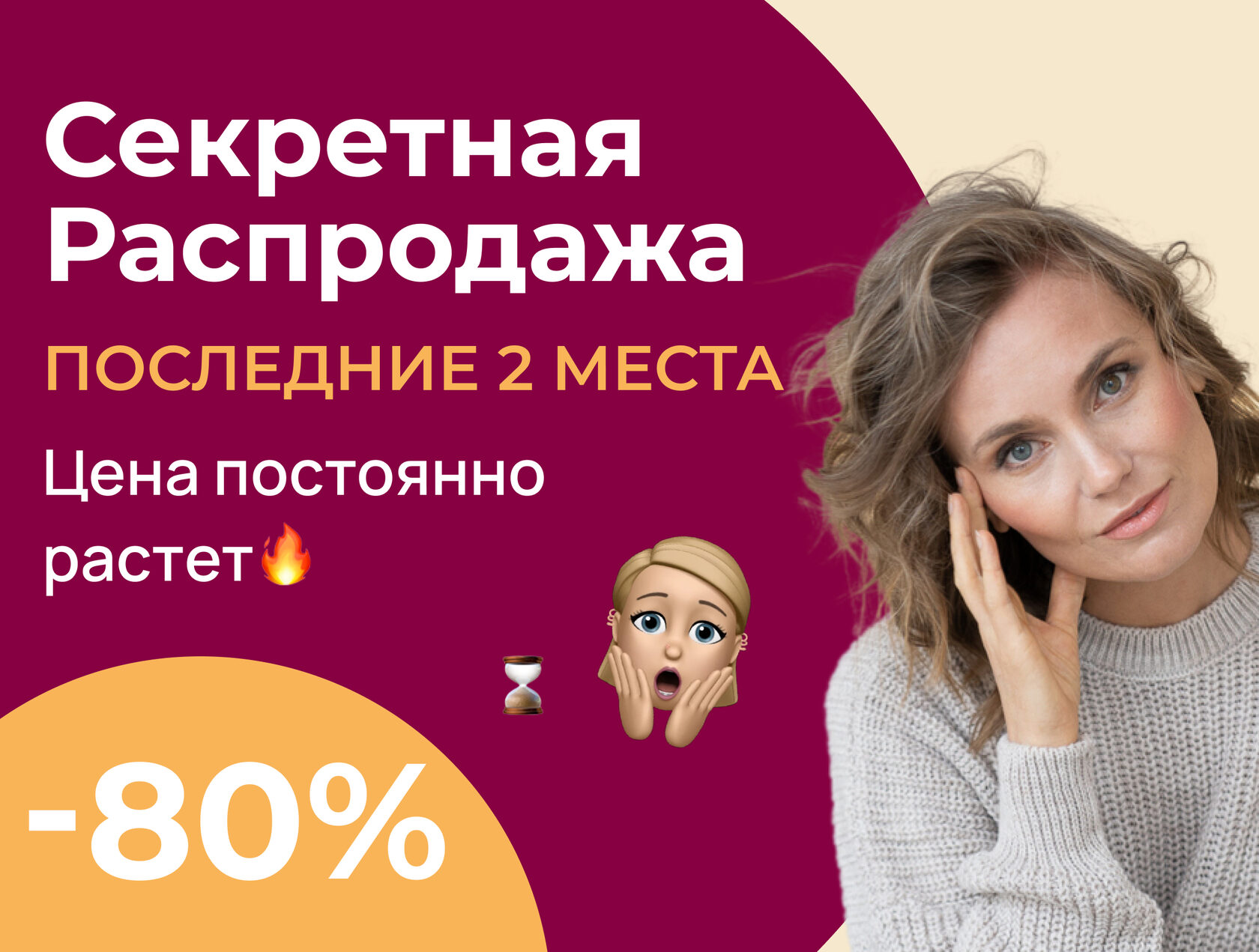 | Дорогие, предлагаю немного помечтать ✨ | | | | ⭐️ Представьте, что вы с утра просыпаетесь, смотрите в зеркало и видите перед собой подтянутый овал лица без отёков, заломов и брылей ❤️ | | | | У меня есть метод, с помощью которого эти мечты станут реальностью! | | | | Секретная распродажа на курсе Азбука Фейсфитнеса! Мегаскидка — 80% на покупку курса. Присоединяйтесь по лучшей цене.