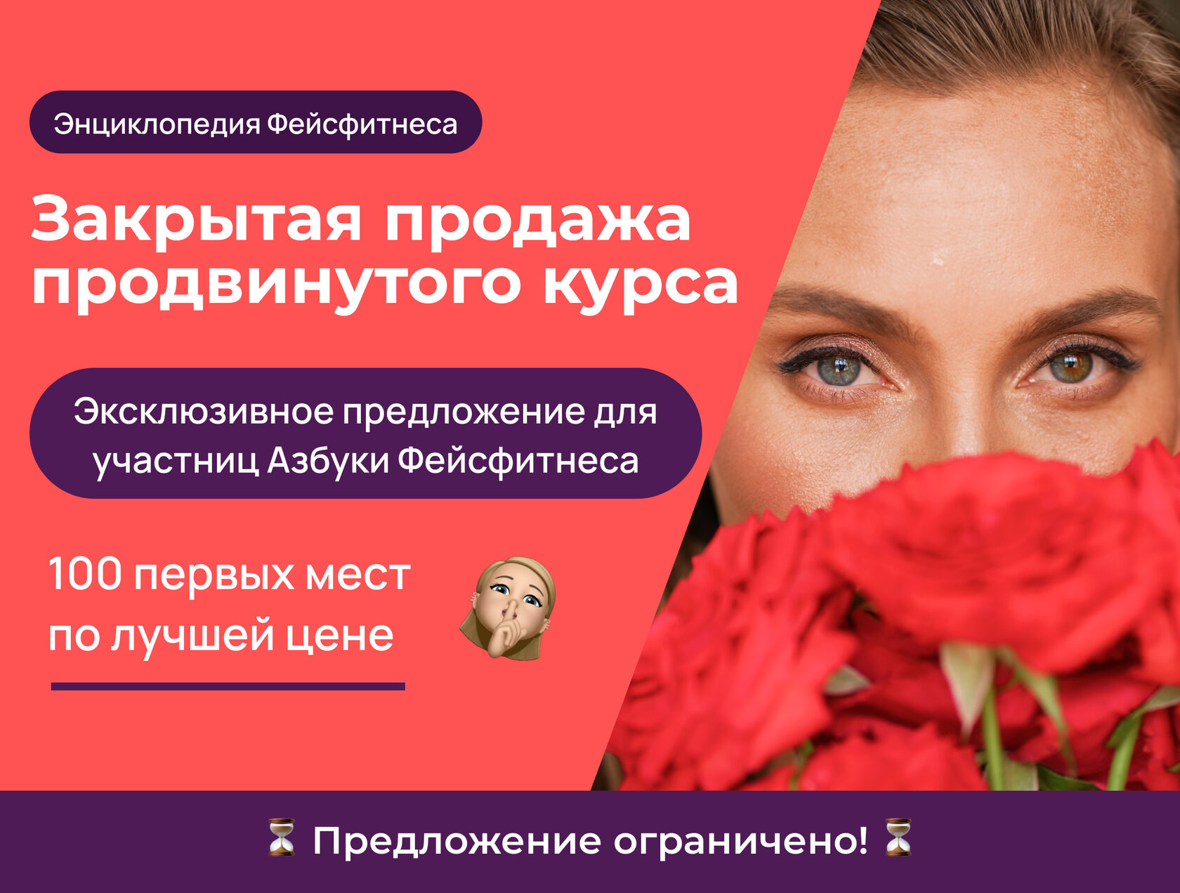 | Вы ждали, вы спрашивали, и, наконец, этот день настал. Открыты продажи нового курса Энциклопедия Фейсфитнеса для продвинутого уровня! Вы узнали о нем в числе первых. | | | | Закрытая продажа только для учениц Азбуки Фейсфитнеса: самая низкая цена для первых 100 участниц в честь запуска!