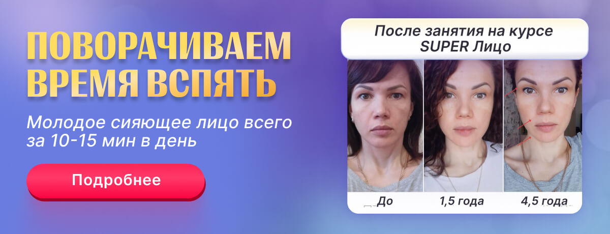 ⏩ Начинайте утро или заканчивайте день с этих трёх упражнений, и уже через неделю вы заметите, что кожа становится более упругой: | | | | | Упражнение от нависшего века | | | | | 1️⃣ Соедините указательные пальцы и положите их в самую глубокую точку на переносице. 2️⃣ Большие пальцы положите на нижние веки под ресницы, другие выпрямите и расслабьте. 3️⃣ Поднимите кожу на переносице на пару миллиметров, а кожу под глазами слегка начните тянуть большими пальцами к вискам. 4️⃣ Сильно зажмурьтесь и считайте до 20. | | | | | Упражнение на сглаживание носогубных сладок | | | | | 1️⃣ Вытяните губы вперёд, будто хотите произнести звук «у», а потом «о». 2️⃣ Едва касаясь лица, медленно водите указательными пальцами вверх-вниз по носогубным складкам. 3️⃣ Оторвите пальцы от лица и, держа их перед собой, поднимайте вверх-вниз. 4️⃣ Сосчитайте до 20. | | | | 1️⃣ Закатайте губы вовнутрь, чтобы в районе щёк всё было натянуто. 2️⃣ Отведите руки на 15−20 сантиметром от лица. 3️⃣ Прищурьте нижние веки и смотрите в потолок. 4️⃣ Делайте круговые движения руками на протяжении 15 секунд — в скулах должно появится жжение. | | | | Уже этот комплекс даст вам видимые результаты. А на курсе SUPER Лицо более 30 упражнений, с которыми вы глубже проработаете все возрастные изменения: второй подбородок, межбровка, морщинки на лбу.