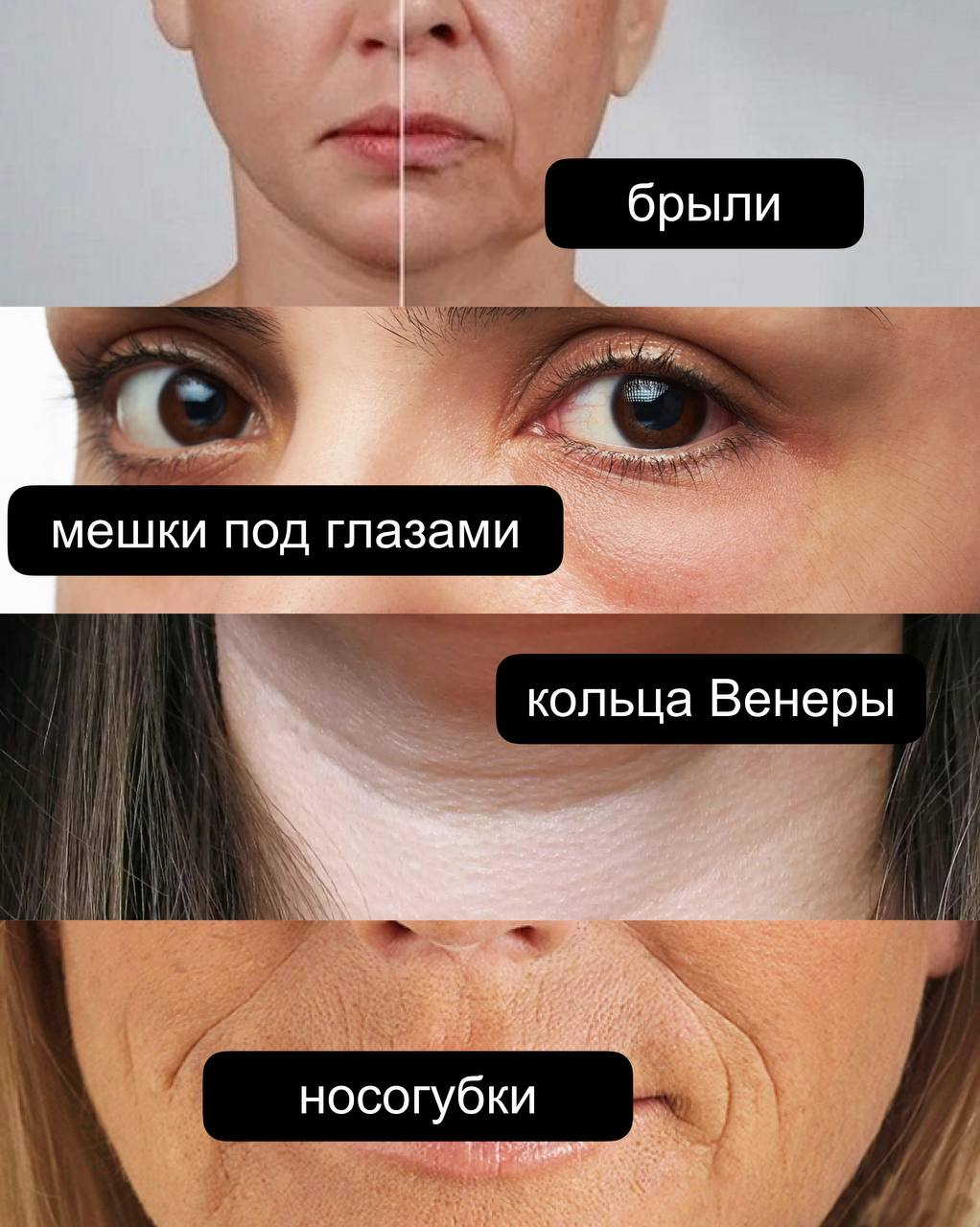 ⛔ поплывший овал лица; ⛔ второй подбородок; ⛔ отечность и мешки под глазами; ⛔ брыли; ⛔ носогубные складки и межбровка.