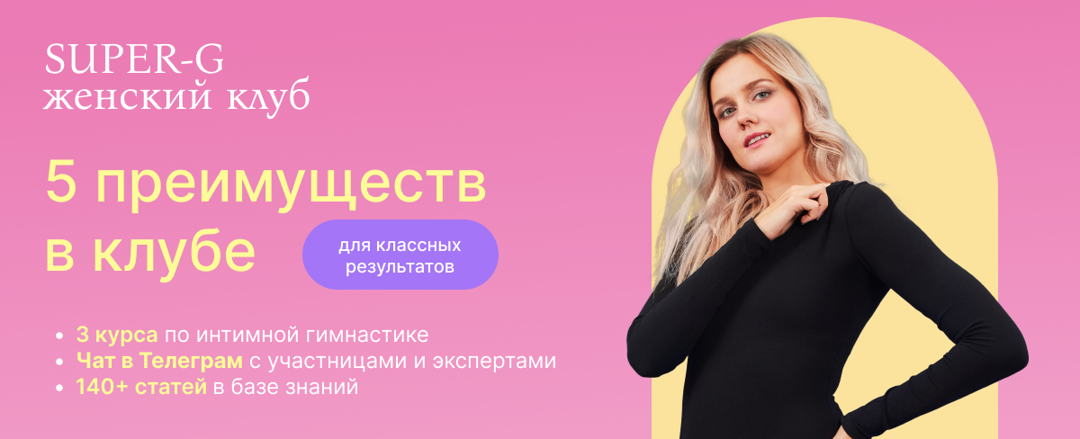 Как? С помощью регулярных тренировок интимной гимнастикой ✅ Проще всего поддерживать мотивацию и дисциплину к тренировкам, а также узнать о своём теле больше — вступить в Клуб SUPER-G! | | | | Приобретая доступ в Клуб сейчас, вы получаете: