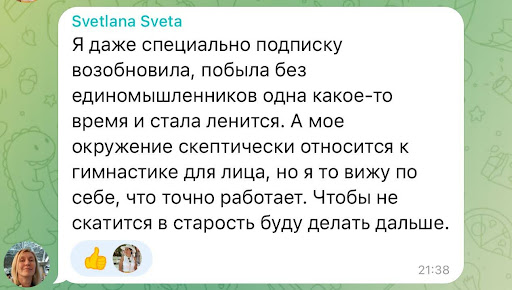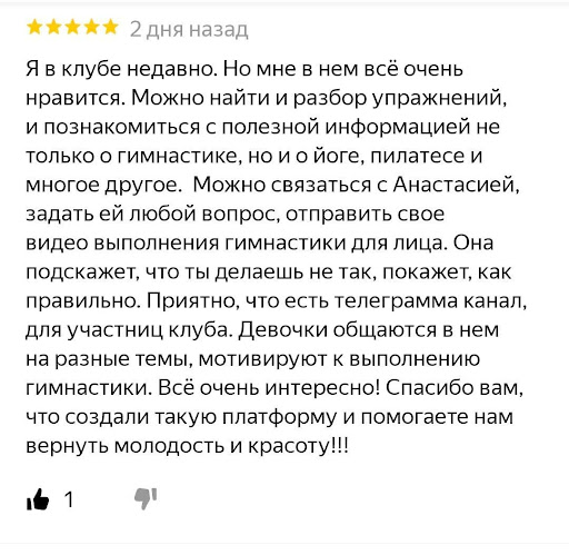 ✅ еженедельные встречи и рубрика вопрос-ответ в чате со мной — это возможность потренироваться вместе и получить личные рекомендации; ✅ закрытый чат, где ученицы делятся своим опытом и тренируются вместе; ✅ база полезных материалов, с помощью которой вы сможете проработать сложные упражнения и избавиться от ошибок, а также узнать полезную информацию о красоте и здоровье.