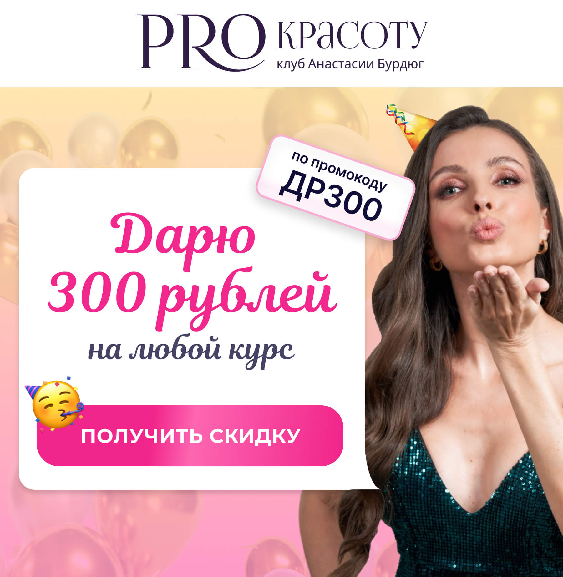 | Здравствуйте, мои дорогие! Вчера мне исполнилось 43 года. Цифры в паспорте меня давно не пугают, ведь гимнастика для лица ставит старение на паузу. ❤️ | | | | Вы знаете, как я люблю делать подарки своим ученицам. И мой день рождения — не исключение. | | | | В честь праздничного события дарю скидку 300 рублей на любой курс в дополнение к вашей подписке по промокоду “ДР300”! Оплата единоразовая, доступ к приобретенному продукту сохранится на весь срок вашей подписки. | | | | Воспользуйтесь скидкой прямо сейчас и расширьте возможности своей подписки ⚡️ | | | | 1. Выберите курс или набор всех курсов 2. Нажмите “Купить” 3. На странице заказа введите промокод “ДР300” и нажмите “Проверить” 4. Сумма заказа пересчитается со скидкой автоматически 5. Нажмите “Оплатить” и введите данные карты | | | | Расширьте возможности своей подписки, дополнив ее курсами на выбор: | | | - SUPER Лицо PRO — новые продвинутые упражнения из гимнастики для лица;