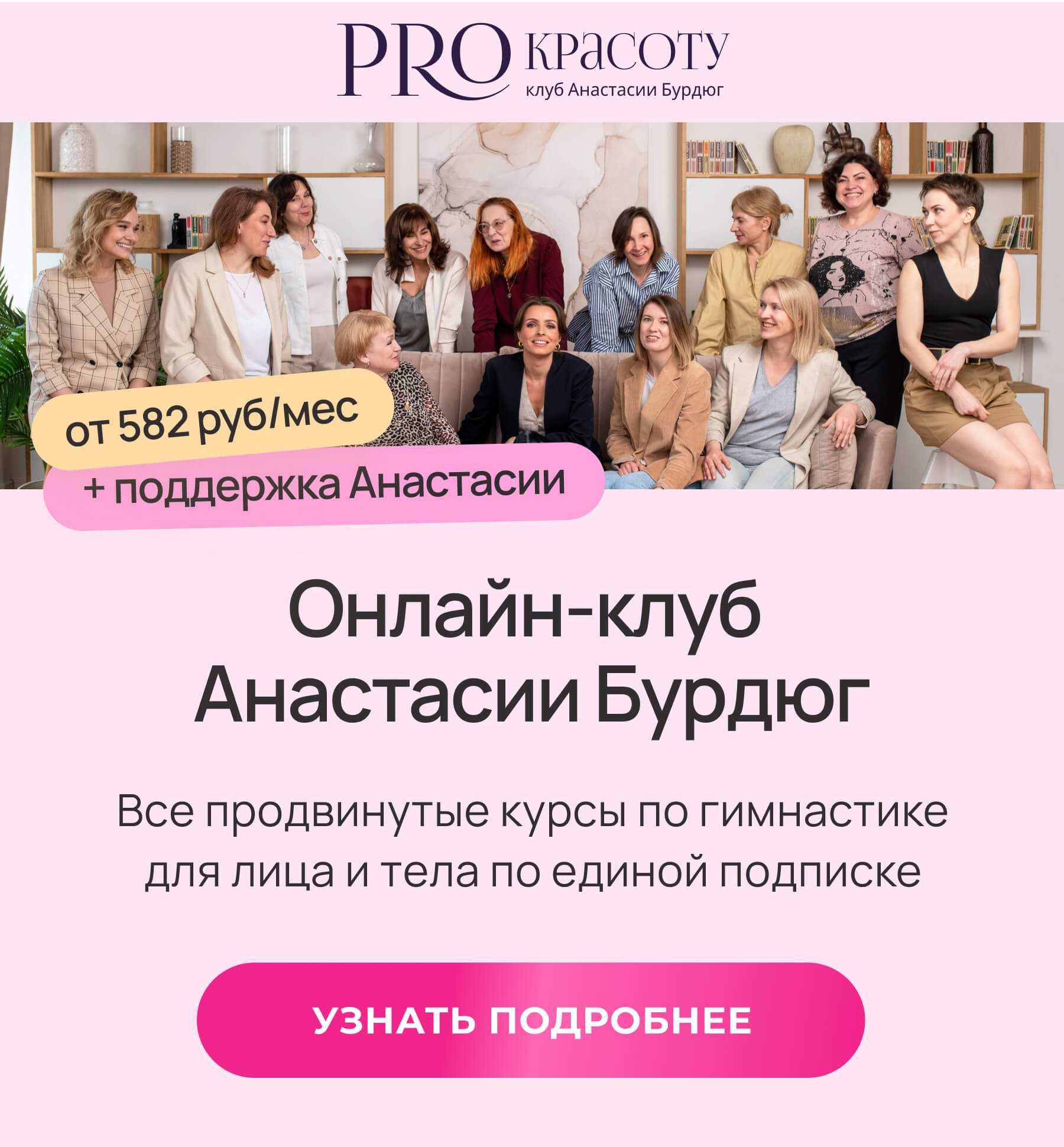| Всё ещё задумываетесь, стоит ли добавить к гимнастике для лица упражнения из курса SUPER Лицо PRO? Проверьте себя! | | | | 1️⃣ Прошли базовый курс, но проблемные зоны, такие как мешки под глазами, кольца Венеры, второй подбородок, нуждаются в дополнительной проработке? | | | | 2️⃣ Хотите работать не только с лицом, но и с телом, выровнять осанку и избавиться от болей в спине? | | | | 3️⃣ Освоили все базовые упражнения, хотите повышать свой уровень владения гимнастикой и добавить к тренировкам новые продвинутые комплексы от Анастасии Бурдюг? | | | | Если хотя бы на один вопрос вы ответили: “Да”, то курс SUPER Лицо PRO вам точно подойдёт! Присоединяйтесь к клубу PRO Красоту, получайте доступ к курсу и добавляйте новые упражнения к своим тренировкам уже сегодня. ✨ | | | | Ученицы Анастасии отмечают, что с курсом SUPER Лицо PRO они быстрее приходят к желаемым результатам ❤️ | | | | В клубе есть все инструменты, которые помогут вам наиболее эффективно внедрить новые комплексы и закрепить их: | | | | ◼ онлайн-встречи с Анастасией Бурдюг — прямые эфиры, мастер-классы, онлайн-тренировки; ◼ библиотека материалов с видеоразборами от Анастасии и статьями на темы красоты, здоровья и психологии; ◼ доступ в закрытый чат с ученицами, которые поддерживают друг друга и мотивируют на регулярные тренировки; ◼ возможность отправить свой вопрос по технике Анастасии. | | | | ❤️ Также при вступлении в клуб вы получите ещё 2 курса: Мьюинг для всех и SUPER Тело. Переходите на сайт, выбирайте тариф и оформляйте подписку — желаемые результаты станут ещё ближе! | | | | | | Вы получили это письмо, потому что оставили свои данные на сайте anyclass.com | | | |