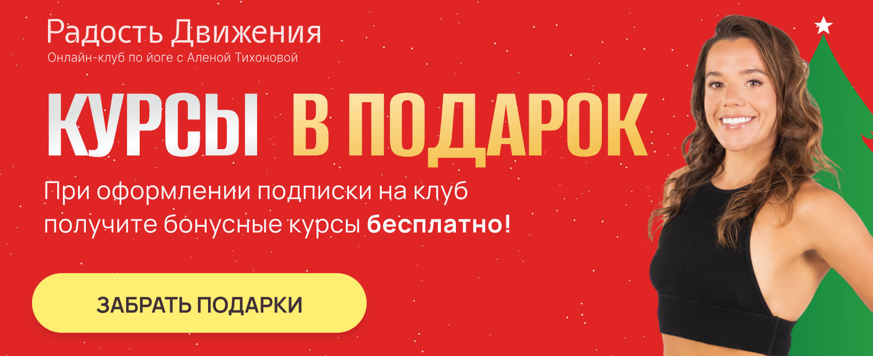 | В канун Нового года я дарю вам подарки при оформлении любого срока подписки на клуб Радость Движения! ⛄️ | | | | | Практикум “5 волшебных техник йоги” | | | | | | Практикум “5 волшебных техник йоги” | | | | Интенсив “Продвинутые практики” | | | | | Выбирайте комфортный срок доступа и начинайте новый, 2024 год с действий! ✊ | | | | Как часто вы слышите эту фразу? Каждый год мы обещаем себе правильно питаться, заниматься спортом, уделять время себе, а переходят ли эти обещания в действия? Редко… ☹️ | | | | Давайте сделаем исключение в 2024! И не просто пообещаем, а действительно займемся собой. В клубе Радость Движения сделать это совсем не трудно. | | | | Вы уже занимались на курсе Легкая йога, ощутили пользу и эффективность тренировок. Клуб поможет вам: | | | - достичь регулярности, а не расстилать коврик от случая к случаю;