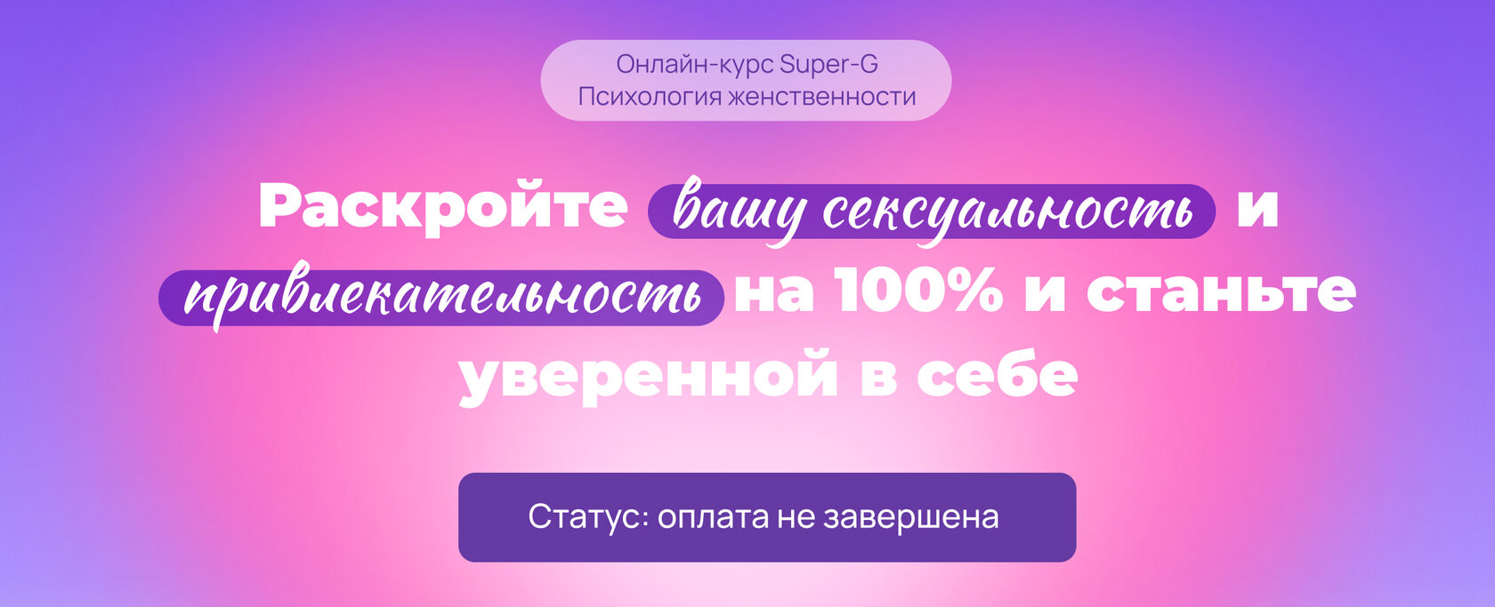 ⏩ Мы занимаемся не только теорией, но и предлагаем практические задания, которые помогут вам по-новому взглянуть на себя и свою жизнь. | | | | Вам остался всего один шаг, чтобы начать свой путь к счастью и уверенности в себе. Представьте, какие изменения ждут вас впереди! ✨ | | | | Раскройте вашу сексуальность и привлекательность на 100% и станьте уверенной в себе! | | | | С любовью, команда Super-G! ❤️ | | | | | | Вы получили это письмо, потому что оставили свои данные на сайте anyclass.com | | | |